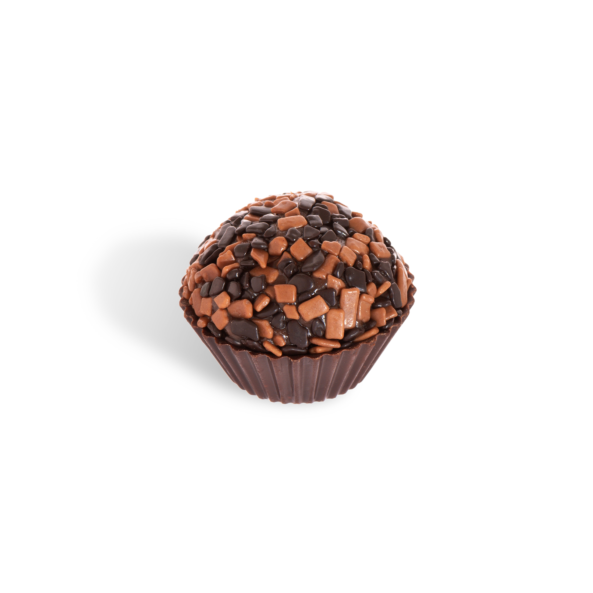 CAMADA FINA DE CHOCOLATE MEIO AMARGO E UM BLEND DE RECHEIOS AO LEITE E AMARGO, COBERTO DE FLAKES BLEND.